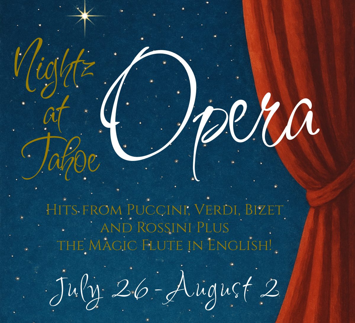 Nightz at Tahoe Opera: Arias, Duets & The Marriage of Figaro, in English. Come to the heart of Tahoe with soaring voices, fiery passion, and unforgettable Opera music!